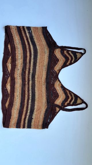 Top de crochet con un diseño de rayas en zigzag. - Tejido de crochet. - Diseño de rayas en zigzag. - Tiras para atar.
