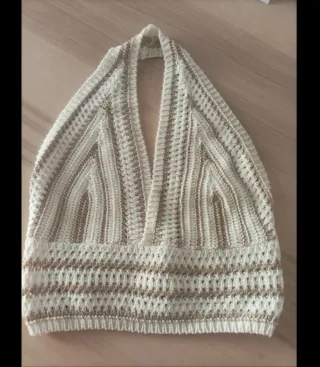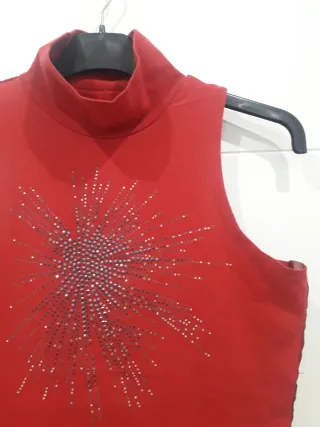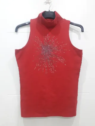 Elegante top sin mangas con cuello alto y un bonito diseño de pedrería. En perfecto estado. Pone talla L pero no es real, es más pequeño, como una S. - Cuello alto. - Sin mangas. - Diseño de pedrería en forma de estrella.