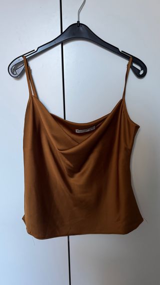 Top de tirantes finos con un elegante drapeado en el escote. Su tejido satinado le da un acabado brillante y sofisticado. - Tejido satinado. - Tirantes finos ajustables. - Escote drapeado.