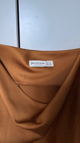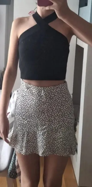 Conjunto de falda y top ideal para Nochevieja o eventos especiales. - Top con cuello halter y detalle fruncido. - Falda con volantes escalonados. - Tejido satinado.