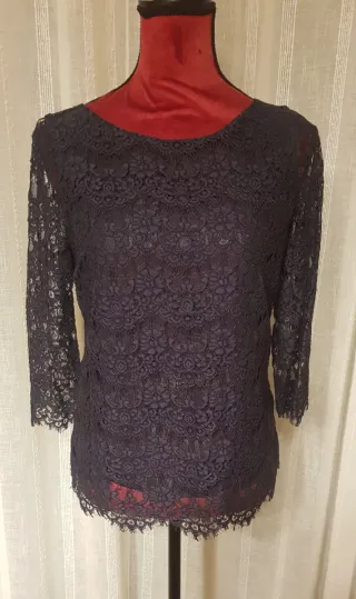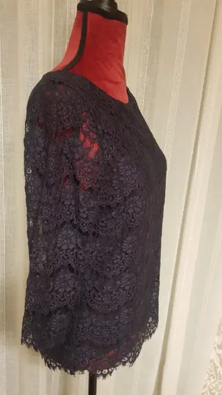 Top asimétrico con detalles de encaje. Escote en V con detalle de encaje. con borde de encaje en la mangas y bordado en la parte delantera. Largo: 70 cm. Ancho: 54 cm.