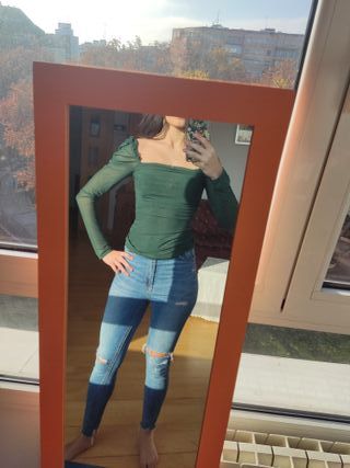 Top ajustado de Shein en tono verde esmeralda, con diseño drapeado en el pecho y cuerpo que realza la silueta. Escote cuadrado con efecto fruncido y mangas largas ligeramente abullonadas en los hombros para un toque romántico y moderno. Talla M. Tejido elástico y cómodo, se adapta muy bien al cuerpo. En perfecto estado, usado solo una vez. Ideal para salir por la noche, cenas especiales o combinar con jeans de tiro alto para un look casual chic.