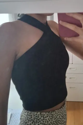 Top negro de Shein con diseño cruzado. - Diseño cruzado en el cuello. - Corte ajustado. - Prenda básica ideal.