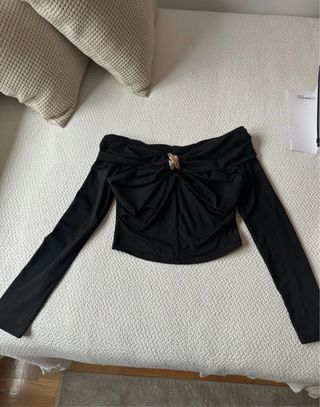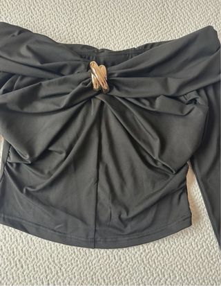 Elegante top con detalle drapeado y un accesorio dorado en el centro. - Diseño de hombros descubiertos. - Mangas largas. - Tejido suave y elástico.