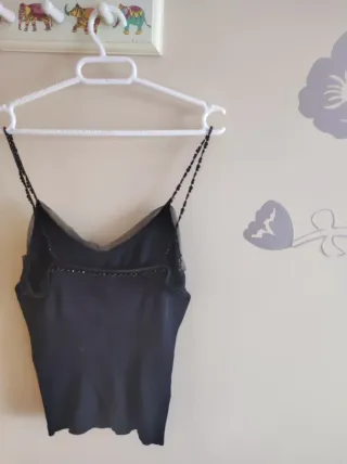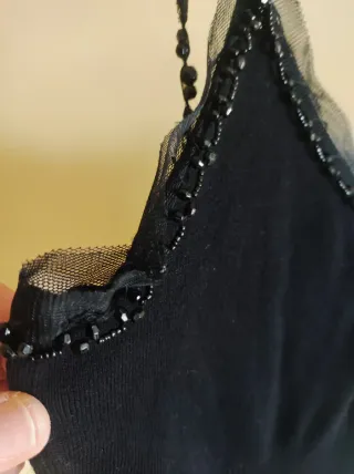 Elegante top negro de Mango con detalles de pedrería. .sin estrenar. Negro de punto. Pone talla M pero es una S. - Tirantes finos con cuentas. - Escote adornado con pedrería y tul. - Tejido acanalado.