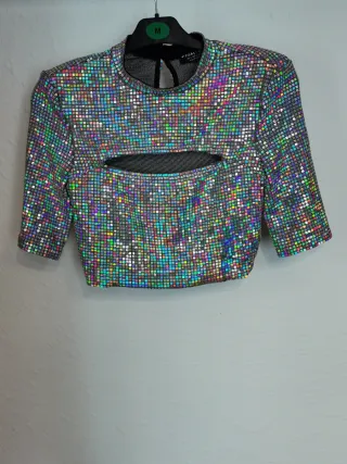 Top con lentejuelas brillantes, perfecto para eventos especiales. - Diseño con tirantes finos. - Acabado metalizado.