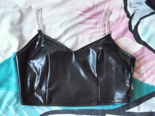 Top corto de polipiel con un diseño moderno. - Tirantes con detalle de cadena plateada. - Escote en pico pronunciado. - Tejido brillante y liso.