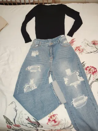 Conjunto de dos prendas para mujer. - Top de manga larga en color negro. Talla M de Bershka - Pantalones vaqueros de corte ancho con rotos y desgastados. Mom talla XL de shein