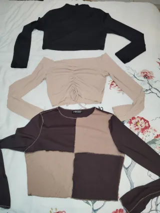 Tres tops de manga larga para mujer, ideales para combinar. - Top negro de cuello alto. - Top beige con escote Bardot y cordón. - Top de patchwork en tonos marrones y beige.