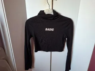 Camiseta corta de manga larga con cuello alto. - Diseño sencillo y versátil. - Detalle de texto BASIC en el pecho.