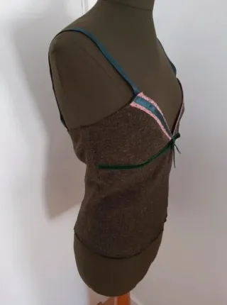 Top de tela gruesa de Stradivarius Talla M Foto hecha sobre maniquí talla S/M De tirantes finos que se pueden hacer más largos si se desea porque lleva más longitud de tirante en la parte interior trasera y se podrían coser a la medida deseada. Cremayera lateral La tela es tupida y abriga Lleva forro. Con adorno de puntilla en color rosa claro la parte delantera y lazada verde en terciopelo Se puede usar con un jersey fino de cuello alto debajo en invierno Muy bonito Cuidado Poco uso Como nuevo Una pieza muy original