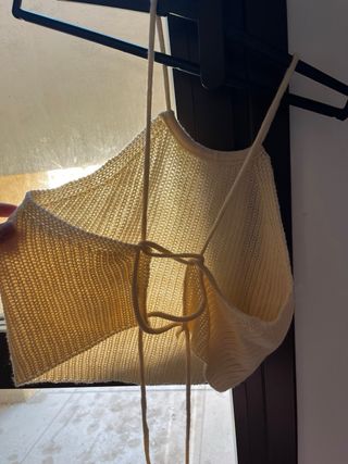 Crop top de tejido acanalado con un diseño coqueto. - Tirantes finos. - Detalle de lazada en el escote. - Bajo con acabado festoneado.