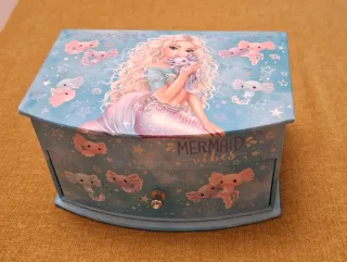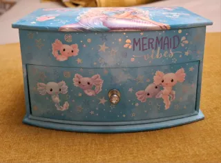 Precioso joyero infantil con un diseño encantador de sirenas y axolotes. - Decoración temática marina. - Incluye un pequeño cajón. - Tirador con detalle brillante.