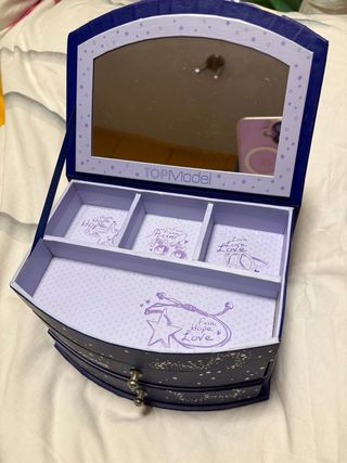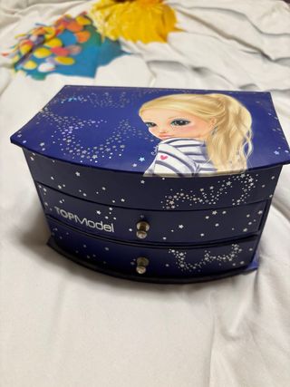Precioso joyero de Top Model con un diseño estrellado. - Diseño azul con estrellas plateadas. - Ilustración de una chica Top Model en la tapa. - Tres cajones para organizar tus tesoros. - Tiradores con detalles brillantes.