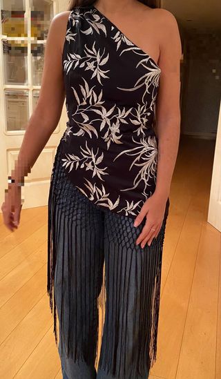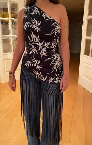 Top negro con un diseño único y elegante, tipo mantocillo. - Estampado floral bordado. - Detalle de flecos largos. - Corte asimétrico. Nuevo sin usar.