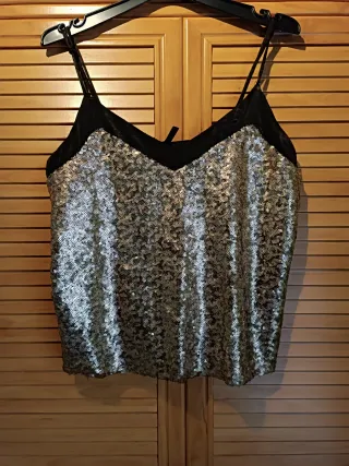 Top de fiesta con lentejuelas doradas, perfecto para ocasiones especiales. - Diseño con tirantes finos. - Escote en V pronunciado. - Acabado brillante y festivo