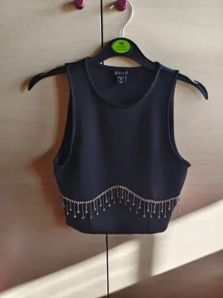 Elegante top negro con detalles de pedrería en el bajo, perfecto para ocasiones especiales. - Diseño sin mangas. - Adorno de pedrería en forma de ondas. - Corte cropped.
