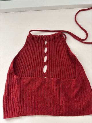 Top estilo halter en color rojo, con un diseño de canalé y detalles de botones. - Tejido de canalé. - Aberturas frontales. - Tirantes para atar al cuello.