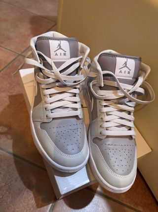Zapatillas de la marca Jordan en tonos gris y blanco. - Diseño de corte medio. - Detalle del logo Jordan Wings. - Swoosh lateral. - Cordones blancos.