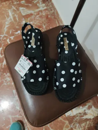 Sandalias de esparto con un divertido estampado de lunares. - Diseño de tiras. - Cierre con pulsera al tobillo. - Suela de yute.