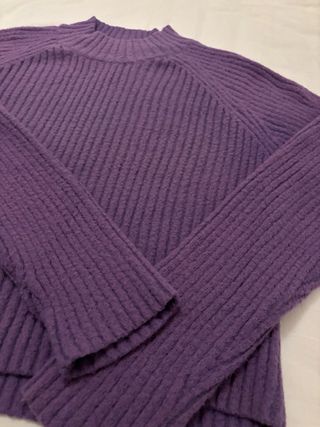 Jersey de punto en color malva, con un diseño acanalado que le da textura. - Cuello redondo alto. - Manga larga raglán. - Tejido suave y cálido.