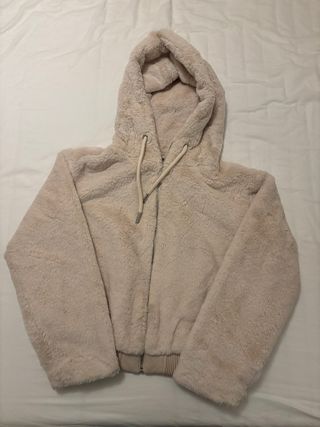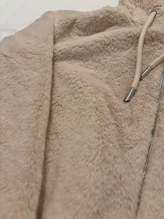 Chaqueta de pelo suave en color beige, con capucha. - Diseño corto. - Cierre de cremallera. - Puños y bajo elásticos.
