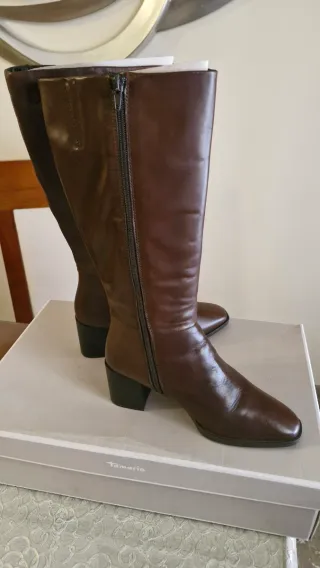 Botas de piel de la marca Tamaris en color marrón. - Talla 39. - Cierre de cremallera lateral. - Tacón cuadrado.