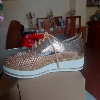 Zapatos de estilo Oxford con un acabado metalizado en tono dorado. Cuentan con una suela de plataforma gruesa y un diseño abierto en los laterales. - Material exterior con textura. - Cordones a tono. - Suela blanca con detalle dorado.