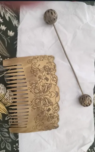 Conjunto de peineta y pincho con un diseño elegante. - Peineta con grabado de mariposas y motivos florales. - Pincho con bola decorativa calada. Pinta y pincho bola huertana color oro Tipo flor i aigua Ideales para bailar, huertana, dansá Tiene un pequeño defecto en una esquina por la laca, de ahí su precio