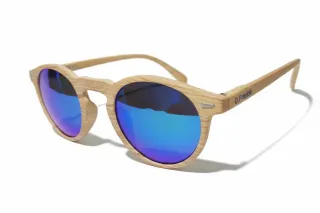Gafas de sol unisex con montura de madera y lentes de espejo. - Montura de madera clara. - Lentes con reflejos verdes, azules y rosados. - Incluye funda y caja de la marca. - Se vende por desuso