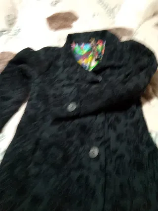 Elegante abrigo negro con un estampado sutil y un forro interior multicolor. Cierre de botones. - Diseño asimétrico. - Cuello alto. - Manga larga.