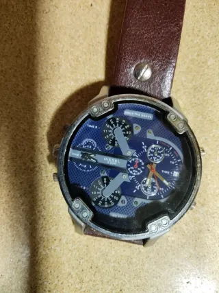 Reloj deportivo con un diseño llamativo y moderno. La correa de cuero marrón complementa la esfera azul. Aunque le falta un un botón funciona perfectamente. - Correa de cuero. - Esfera de color azul.