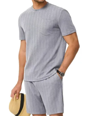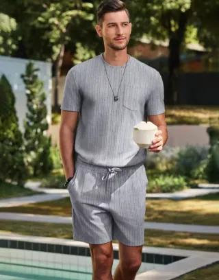 Conjunto de dos piezas para hombre. - Camiseta de manga corta con bolsillo. - Pantalón corto. - Tejido con textura de rayas verticales. - Buena tela. - Conjunto casual.