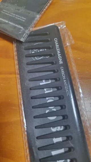 Peine de barbero de la marca CHARLE MAGNE. - Fabricado en fibra de carbono 100%. - Diseño profesional para estilismo. El precio es por unidad. Peine de carbono Charlemagne para hombre - 19 cm, dientes gruesos - Peine de dientes anchos de carbono antiestático e irrompible para desenredar rizos y texturas - Desarrollado por barberos, diseñado en Alemania
