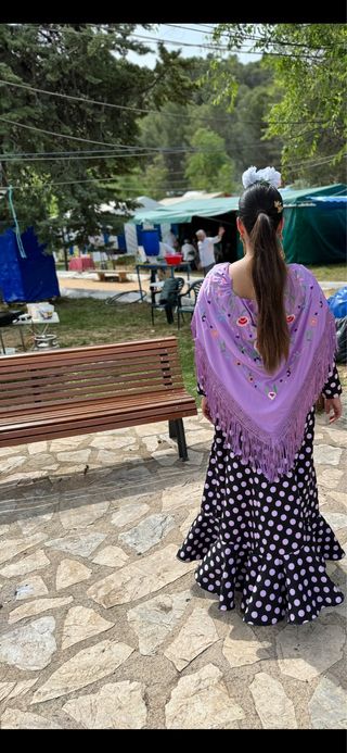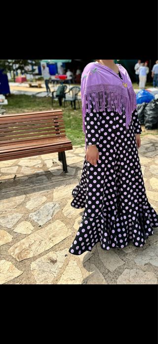 Vestido de flamenca con un diseño llamativo y elegante. - Cuerpo del vestido negro con lunares morados. - Escote y mangas adornados. - Mantón morado bordado con flecos.