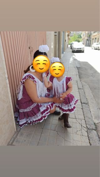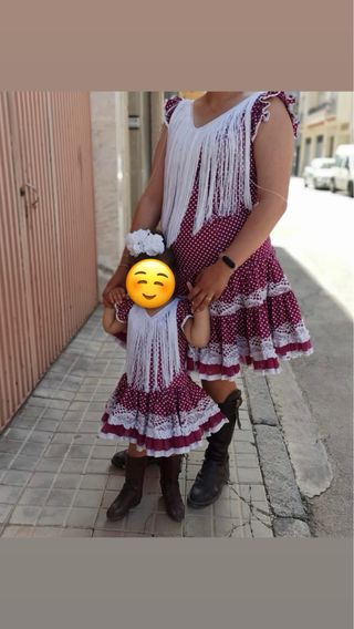 Conjunto de vestidos a juego para madre e hija. - Diseño con estampado de lunares. - Adornos de volantes y flecos blancos. - Ideal para romerías Vestido corto muy cómodo