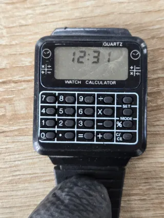 Reloj de pulsera con función de calculadora. Un accesorio práctico y retro. Necesita reparaciones como se puede ver en las fotos. - Diseño tipo calculadora. - Pantalla digital. - Correa negra.