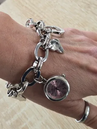 Elegante pulsera con varios charms y un reloj. - Diseño de eslabones plateados. - Charm de corazón calado. - Charm de corazón liso. - Charm de reloj con esfera rosa.