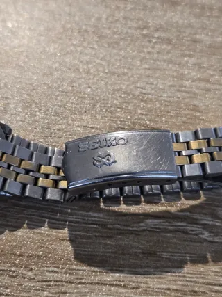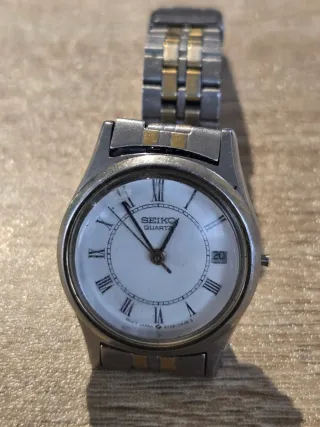 Reloj de pulsera Seiko Quartz con un diseño elegante y atemporal. - Esfera blanca con números romanos. - Indicador de fecha. - Brazalete combinado en tonos plateados y dorados. - La corona está rota y no puedo comprobar si funciona
