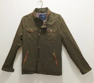 Chaqueta de hombre en color verde, estilo militar. - Cierre de cremallera y botones. - Dos bolsillos en el pecho con solapa y botón. - Dos bolsillos inferiores con cremallera. - Cuello con detalle de tejido a contraste.