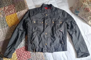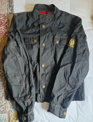 Chaqueta de la marca Belstaff en talla L. Presenta un diseño clásico y resistente. - Cierre principal con cremallera y botones. - Dos bolsillos en el pecho. - Detalle de logo en la manga. - Cuello con ajuste de correa. - Puños ajustables con botones.