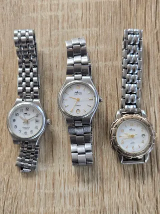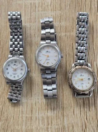 Conjunto de tres relojes de la marca Lotus. - Diseño elegante y moderno. - Brazaletes de metal. - Esferas con detalles dorados. - Un reloj necesita arreglo en la correa pero está funcionando perfectamente - Dos relojes están parados.