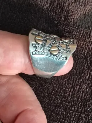 Anillo con un diseño llamativo que combina plata y oro. - Detalles intrincados en la superficie. - Acabado pulido y texturizado.