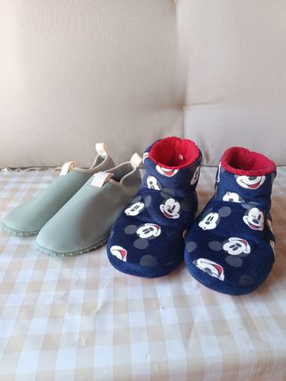 Conjunto de zapatillas cómodas. - Un par de zapatillas de color azul marino con estampado de Mickey Mouse. - Un par de zapatillas cangrejeras de color verde azulado.