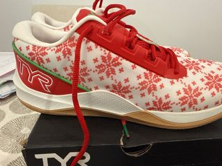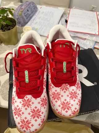 Zapatillas de CrossFit TYR CXT-2 con un diseño festivo de copos de nieve. - Parte superior blanca con estampado de copos de nieve rojos. - Detalles en rojo en la lengüeta y los cordones. - Logo TYR en verde en la lengüeta. - Etiqueta CX T-2 en la lengüeta.