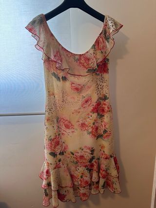Vestido veraniego con un estampado floral vibrante y detalles de volantes. - Diseño con escote en V y volantes. - Bajo con volantes asimétricos. - Estampado de rosas y animal print. Incluye capa o pañuelo