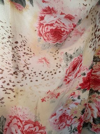 Vestido veraniego con un diseño llamativo y detalles brillantes. - Diseño con estampado floral y paisley. - Adornado con pequeñas cuentas y pedrería. - Tirantes finos ajustables. - Tejido satinado con caída.