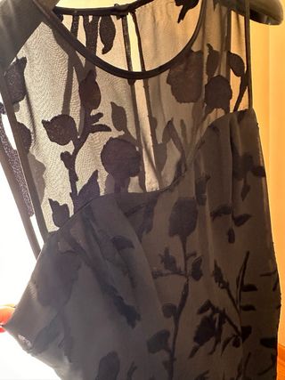 Elegante vestido negro de noche, comprado en Londres. Ideal para ocasiones especiales. - Diseño con detalles florales en la parte superior y lateral. - Tejido de malla transparente con motivos florales. - Corte que favorece la silueta.