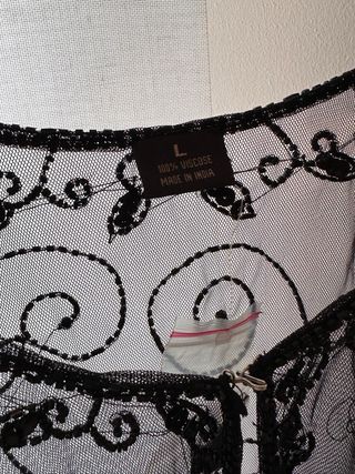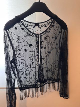 Cárdigan negro con un diseño intrincado de pedrería y flecos. - Tejido de malla transparente. - Adornado con cuentas y bordados florales. - Detalle de flecos en el bajo.