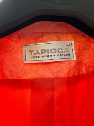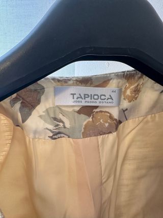Elegante conjunto de vestido y chaqueta de la marca Tapioca. - Chaqueta de corte moderno con detalles florales. - Vestido a juego con estampado floral. - Cinturón de tela para anudar en la cintura.